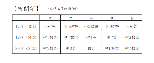 2026年4月以降の時間割(仮)は下記のとおりです